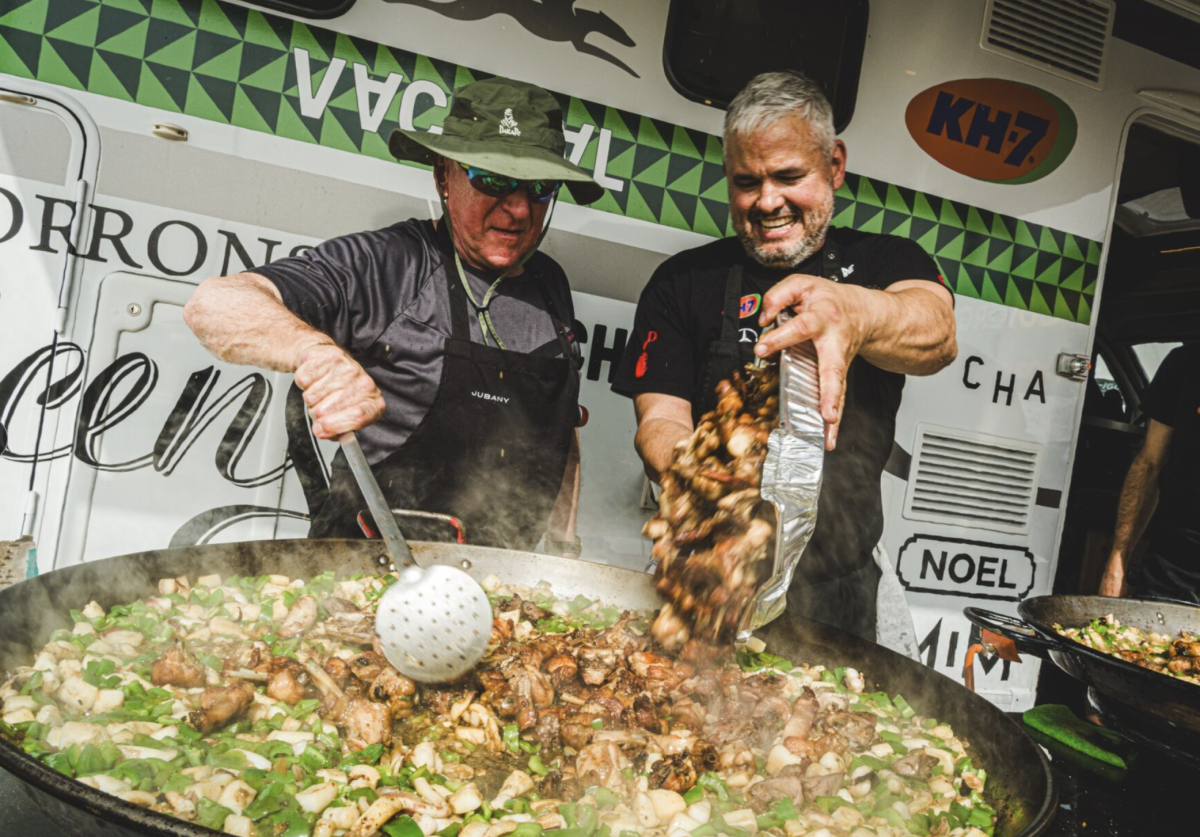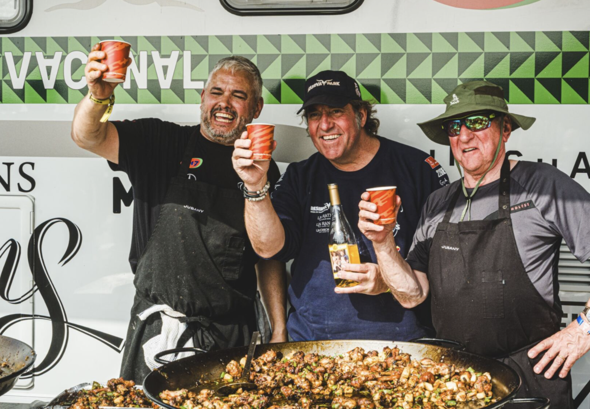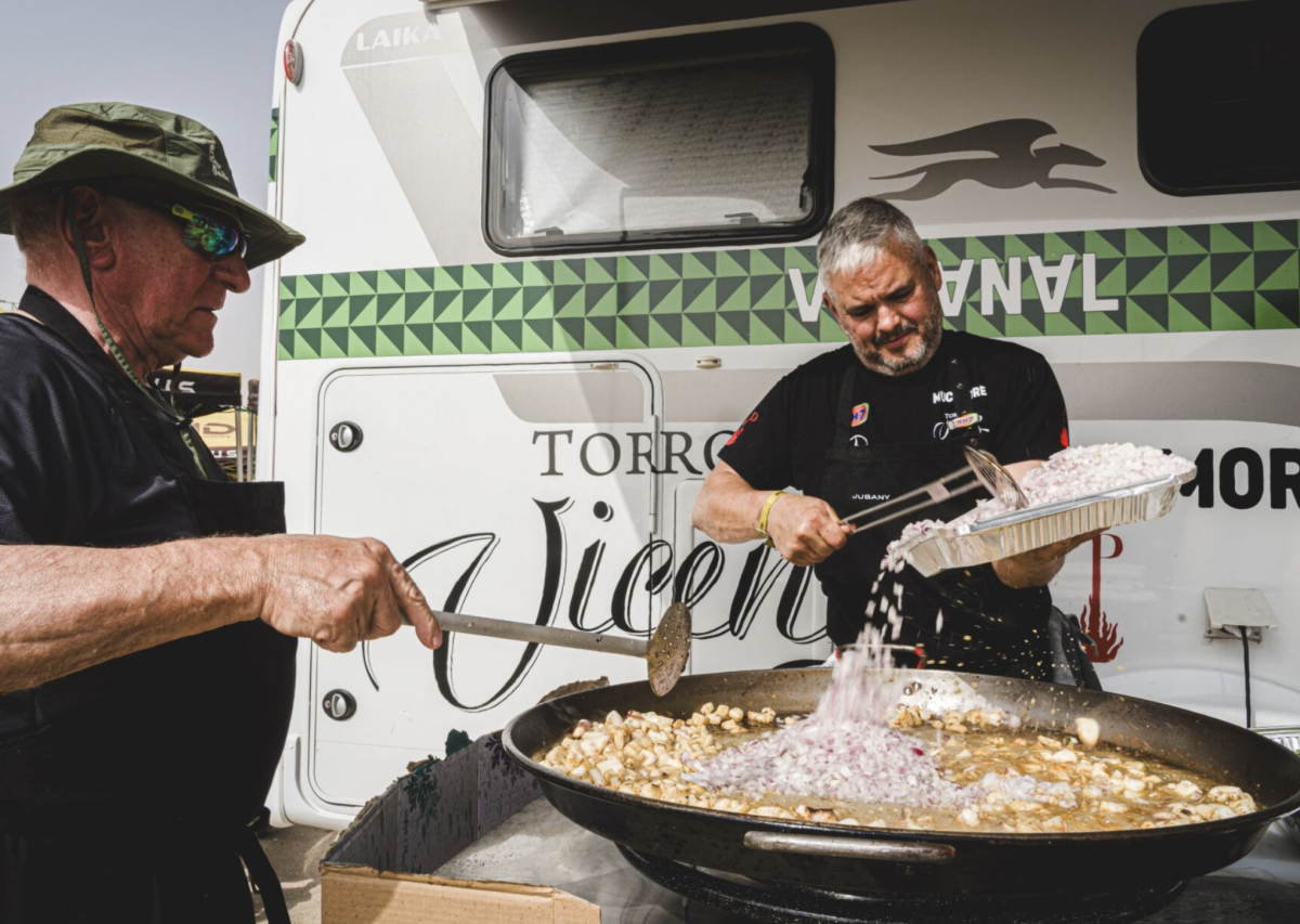 - Más de 100 amigos y compañeros del campamento del Dakar disfrutan de la paella que ha preparado Nandu Jubany junto a su amigo y también cocinero Carles Gaig.