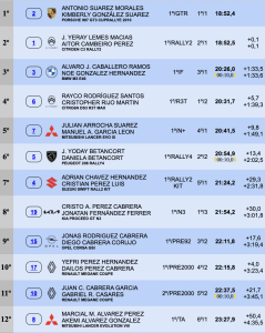 La quinta panza era para ulián Arrocha-M. Alejandro García (Mitsubishi Lancer Evo IX), seguidos de Yoday Betancort-Daniela Betancort (Peugeot 208 Rally4) y los tinerfeños Adrián Chávez-Cristian Pérez (Suzuki Swift R4LLY S Rally2- Kit).