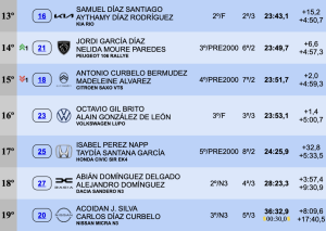 Terceros finalizaron Álvaro Caballero y Noé González (BMW M3 E46), bastante más alejados de los dos primeros, a 1:33,5 y con una penalización de diez segundos, superando en 5,7 a Rayco Rodríguez-Christopher Rijo (Citroën DS3 R3T Max), cuartos, en una bonita lucha por el último cajón del podio.