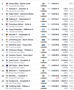 El resultado coloca a Evans por delante de Oliver Solberg y con 13 puntos de ventaja al frente del campeonato de pilotos después de dos rondas, mientras que Toyota amplía su ventaja de fabricantes a 52 puntos sobre Hyundai.