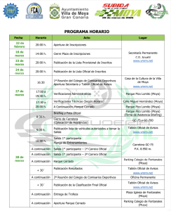 Este lunes ya se abrieron las inscripciones , que permanecerán abiertas hasta el 18 de marzo, a través de la web del proceso de datos VMRM.net. Ya el 24 de marzo se publicará la lista oficial de participantes. El programa continuará en la jornada del viernes 27 con los prolegómenos de la subida, como entrega de documentación y verificaciones de los vehículos, todo ello en el Parque Pico Lomito de Moya, de 16:30 a 20 h.