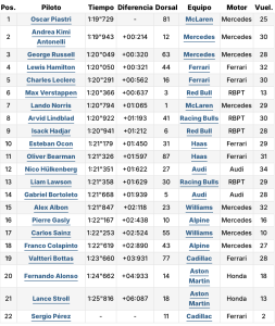 La unidad de Piastri marcó un registro de 1:19.729 en una pista de 5,278 metros de longitud con una ventaja de 0.213 y 0.320, respectivamente, sobre Antonelli y Russell,