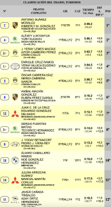 Décimo segundos de la general son Javier Cañada y Aday Ortiz (Opel Corsa Rally4), seguidos de Alejandro Rodríguez y Miguel A. Rodríguez (Renault Clio Rally3).