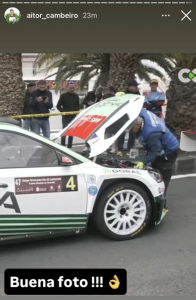 En el fondo de la imagen se observa a los componentes del equipo Copi Sport viendo las verificaciones, pero cuando se abre el capó se realiza una foto al motor del coche de Skoda Canarias, algo que llamó la atención al copiloto Aitor Cambeiro, que en sus redes decía: Buena foto!!