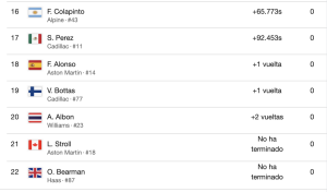 En cuanto a los españoles, el madrileño Carlos Sainz finalizó décimo quinto, a más de un minuto, mientras que Fernando Alonso, que salía penúltimo, acabó décimo octavo.