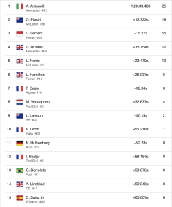 El italiano de 19 años suma su segunda victoria consecutiva tras China y ahora lidera el campeonato de pilotos con 72 puntos, nueve más que su compañero George Russell. Se convierte en el piloto más joven en liderar el mundial de F1, en la historia del Campeonato.