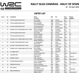 Publicamos la lista oficial de Rally Islas Canarias – Rally de España 2026, cita española del WRC (World Rally Championship).
