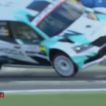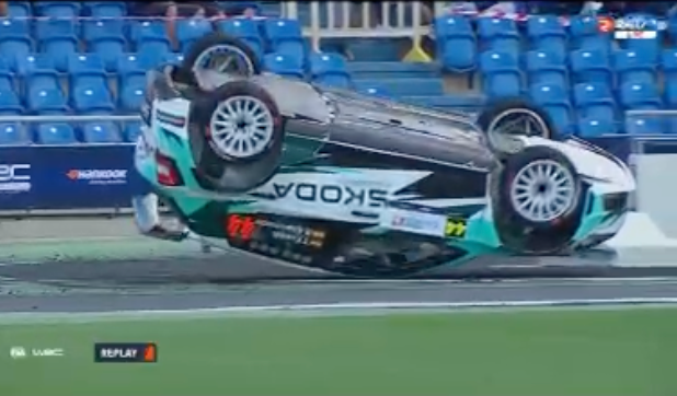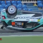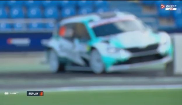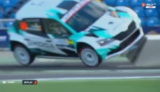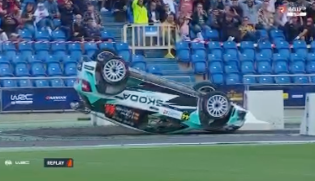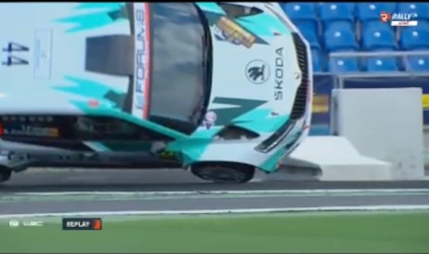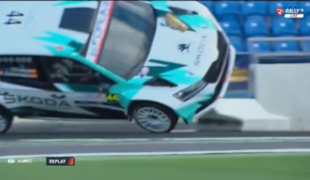 Los catalanes Antonio Forné y Axel Coronado tuvieron la mala suerte de tocar una de las protecciones del tramo espectáculo del estadio de Gran Canaria, el primero del Rally Islas Canarias, lo que propició que el Skoda RS Fabia Rally2 volcara.