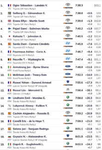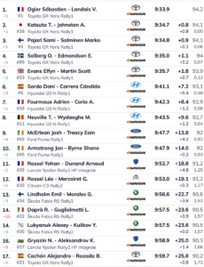 Ogier pasaba al frente de la clasificación con 0.8 sobre Katsuta y 0.9 sobre Pajari. Cuarto es Solberg a 1.1, seguido de Evans a 1.8, siendo el primer equipo de Hyundai el compuesto por los españoles Dani Sordo y Cándido Carrera (Hyundai i20 N Rally1), que son sextos a 7.2. Le siguen sus compañeros Adrien Fourmaux y Alexandre Coria (Hyundai i20 N Rally1) y Thierry Neuville – Martijn Wydaeghe (Hyundai i20 N Rally1), demostrándose, como el año pasado, que los Toyota están un punto por encima de los Hyundai. Por lo menos, en los tramos de Gran Canaria.