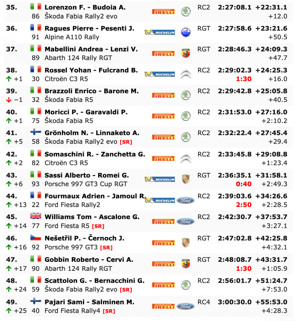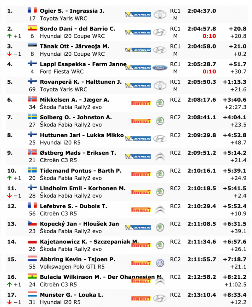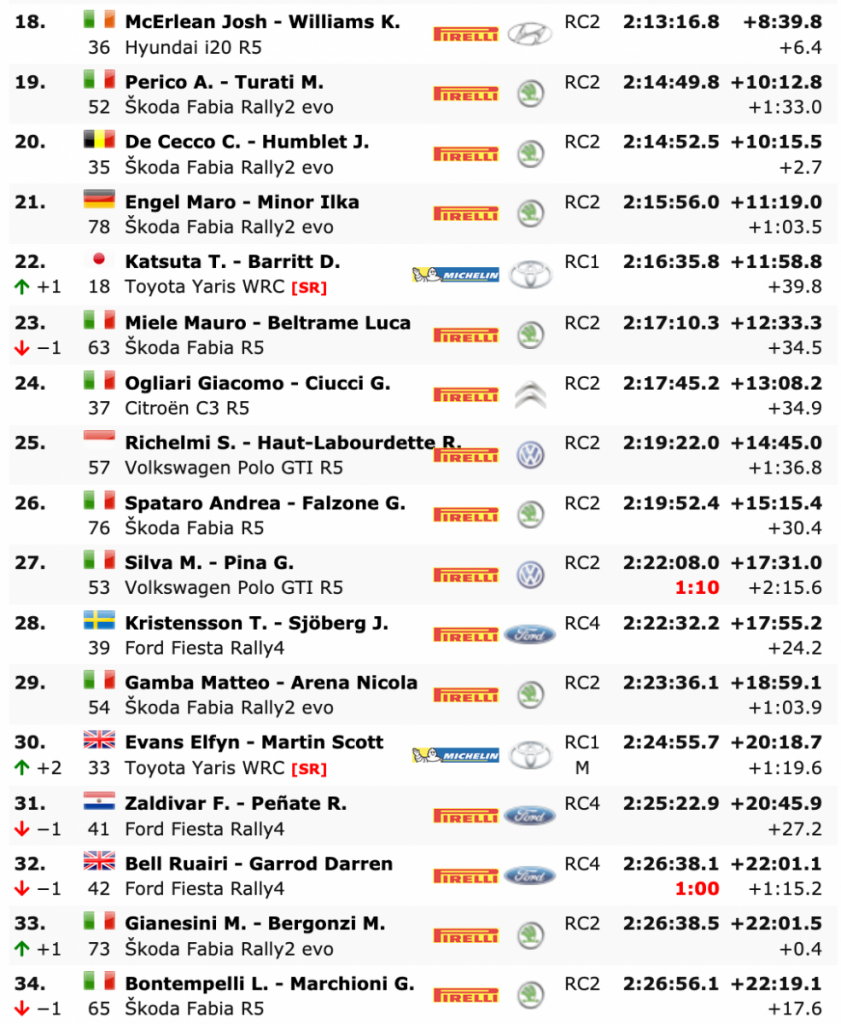 Pero la noticia es que en el primero del día TC14 PZero Grand Prix 3 – 10.31 km -, los cántabros eran los quintos y perdían la segunda plaza, que la ocupaban los los estonios Ott Tänak y Martin Järveoja (Hyundai i20 Coupe WRC), con una renta de 2.7, pero en la siguiente, TC15 Serraglio 1 – 14.00 km -, los españoles eran los más rápidos, superando ahora en la general a sus compañeros de equipo en sólo 0.2, por lo que, con Ogier e Ingrassia como sólidos líderes, con una ventaja de 20.8, el segundo puesto se decidirá en el tramo de TC16 Serraglio 2 [Power Stage] – 14.00 km -.