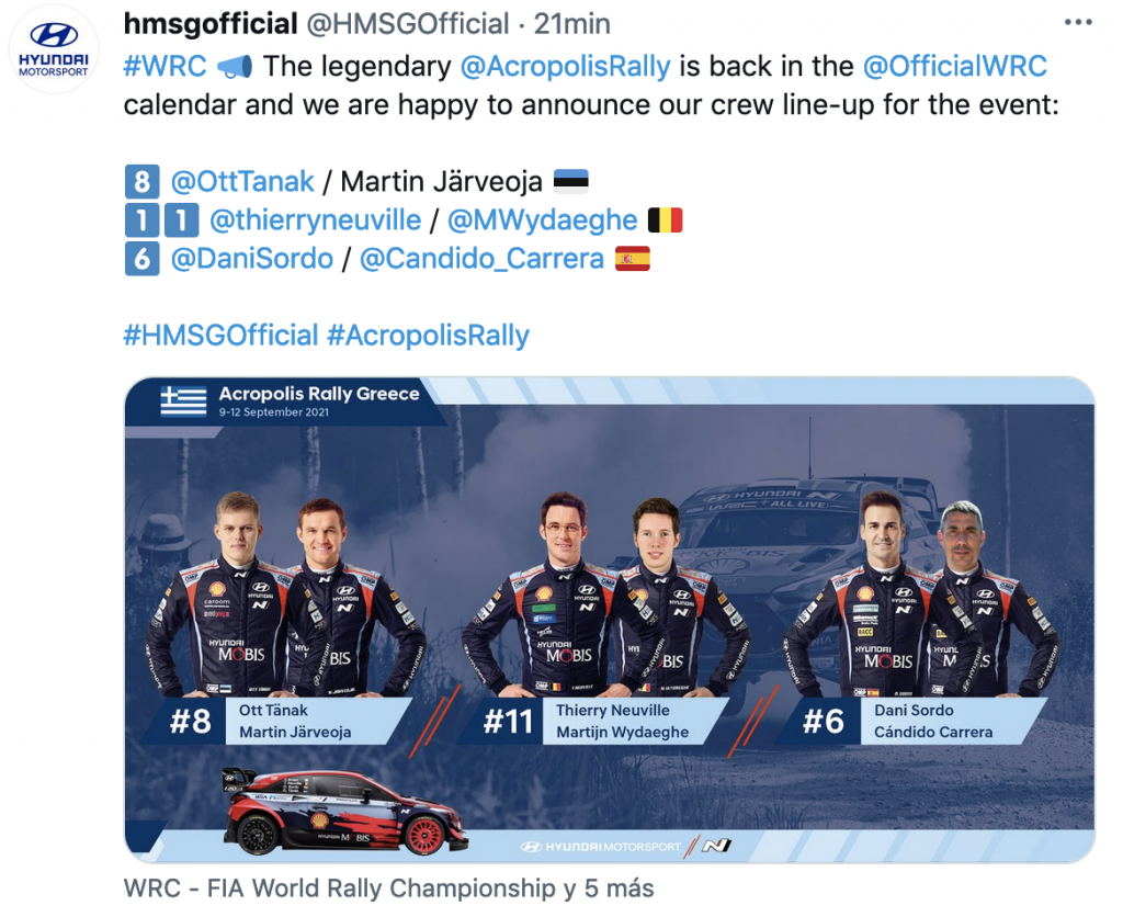 Hyundai Motorsport ha confirmado su alineación de pilotos y copilotos para el Rally Acrópolis de Grecia, donde el tercer equipo lo formarán los españoles Dani Sordo y Cándido Carrera.