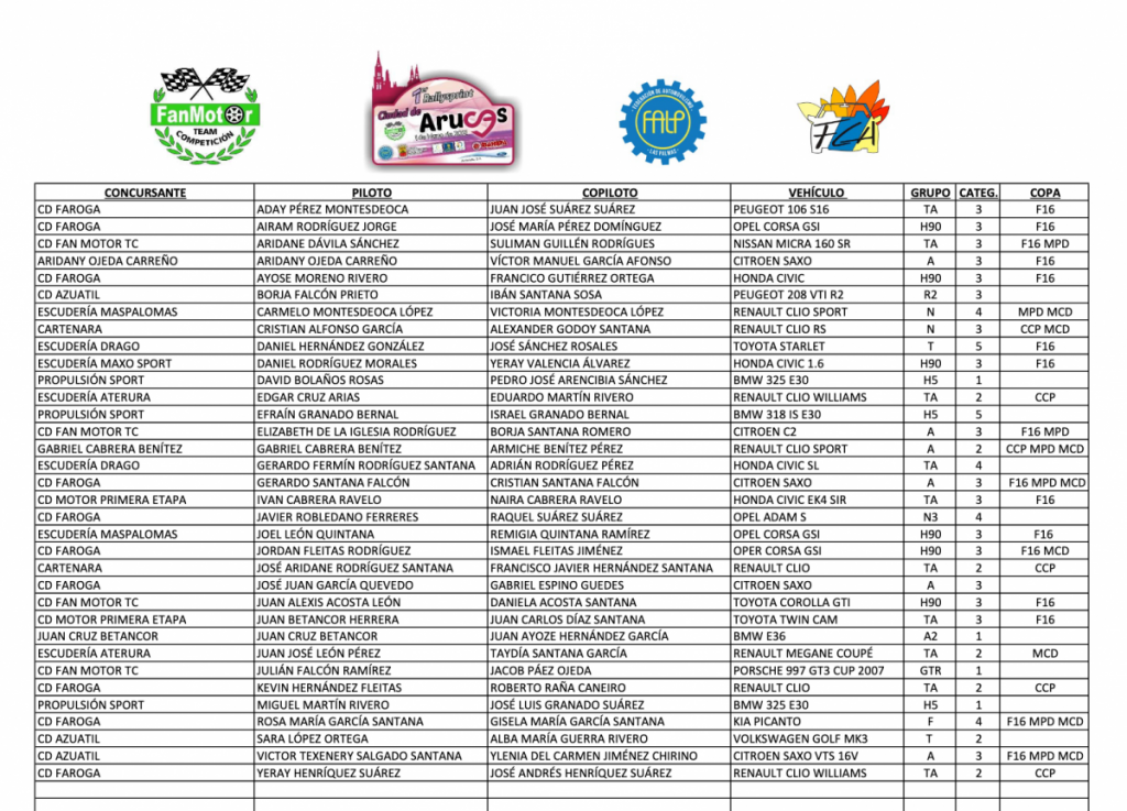 El I Rallysprint Ciudad de Arucas dará por finalizado, a las 20 horas de este jueves, su periodo de inscripción, donde, a parte de las féminas Elisabeth de la Iglesia-Borja Santana (Citroën C2), Rosa María y Gisela García (KIA Picanto) y Sara López-Alba Guerra (VW Golf), destaca la presencia de Julián Falcón con su Porsche 911 GT3 después de un tiempo apartado de la competición, y el debut del también aruquense Borja Falcón a los mandos de un Peugeot 208 R2 entre los casi 40 los equipos pre-inscritos en la cita que se celebrará el norte de la isla de Gran Canaria.