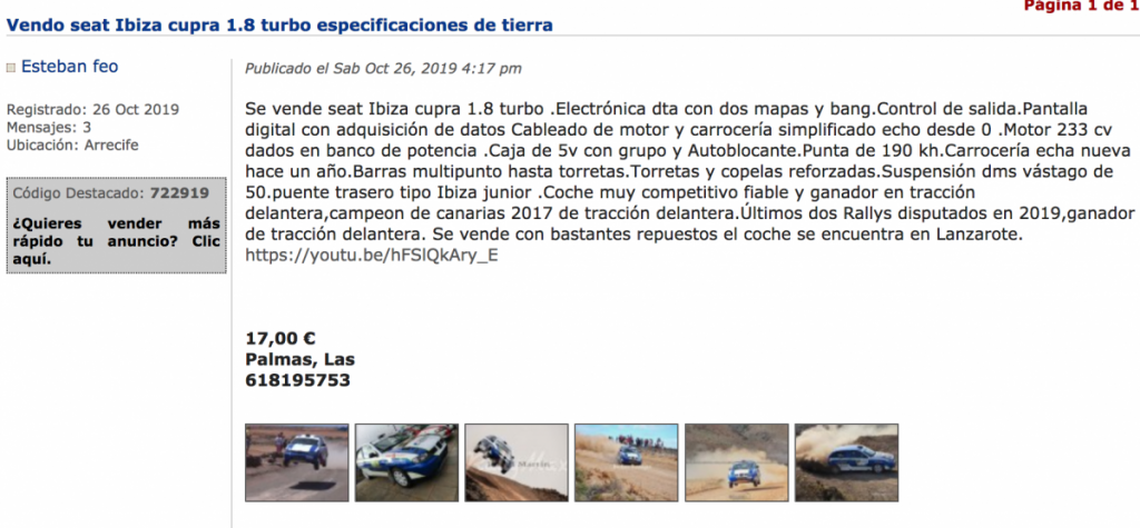 Hace días que el piloto lanzaroteño Esteban Feo ha puesto en venta su Seat Ibiza buscando ‘evolucionar’.