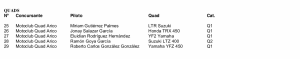Por último, el apartado de quads lo componen Miriam Gutiérrez (LTR Suzuki), Jonay Salazar (Honda TRX 450), Eluidian Rodríguez (YFZ Yamaha) y Roberto González (Yamaha YFZ 450), todos ellos en Q1, además de Ramón Goya (Suzuki LTZ 400) en categoría Q2.
