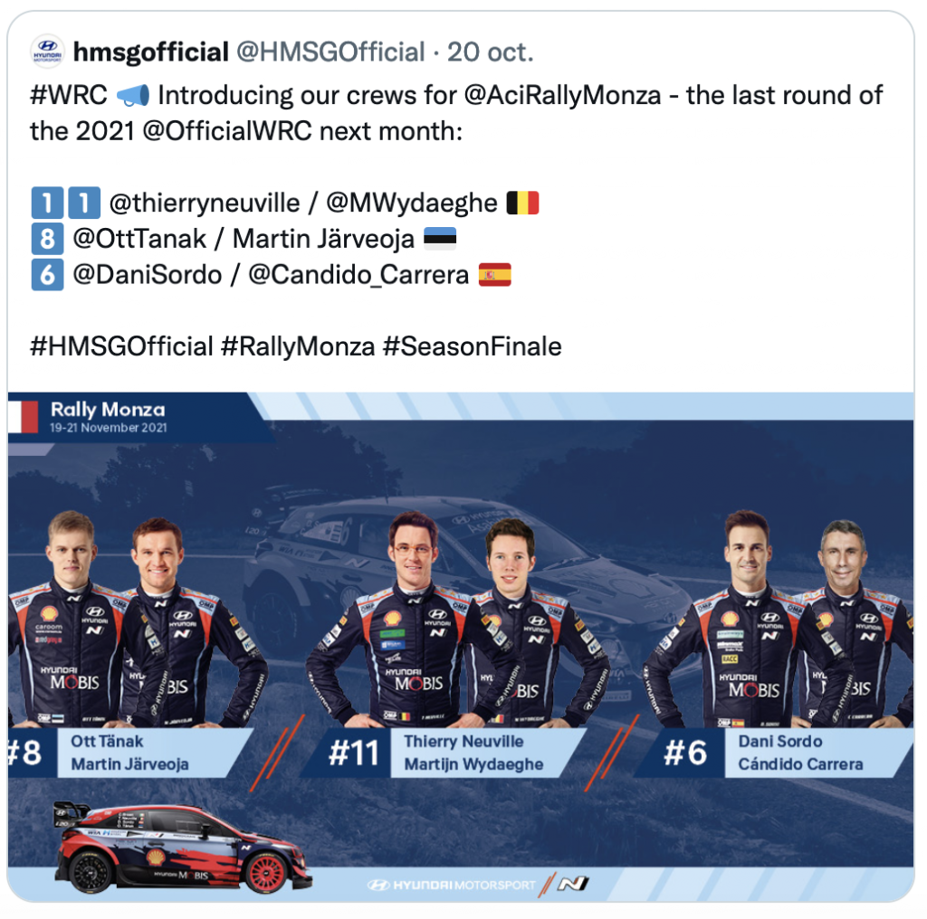 El piloto español Dani Sordo, que junto al copiloto gallego Cándido Carrera lograron ser terceros clasificados del último RallyRACC, cerrará la temporada 2021 del Campeonato del Mundo de Rallys en el Rallye de Monza, última cita del curso.